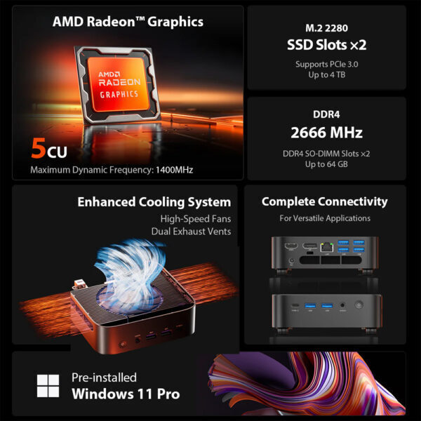 Τα Radeon™ Vega 6 γραφικά υποστηρίζουν τριπλή έξοδο 4K@60Hz μέσω HDMI, DisplayPort και USB-C, ιδανικό για γραφεία, δημιουργικές εφαρμογές και digital signage.