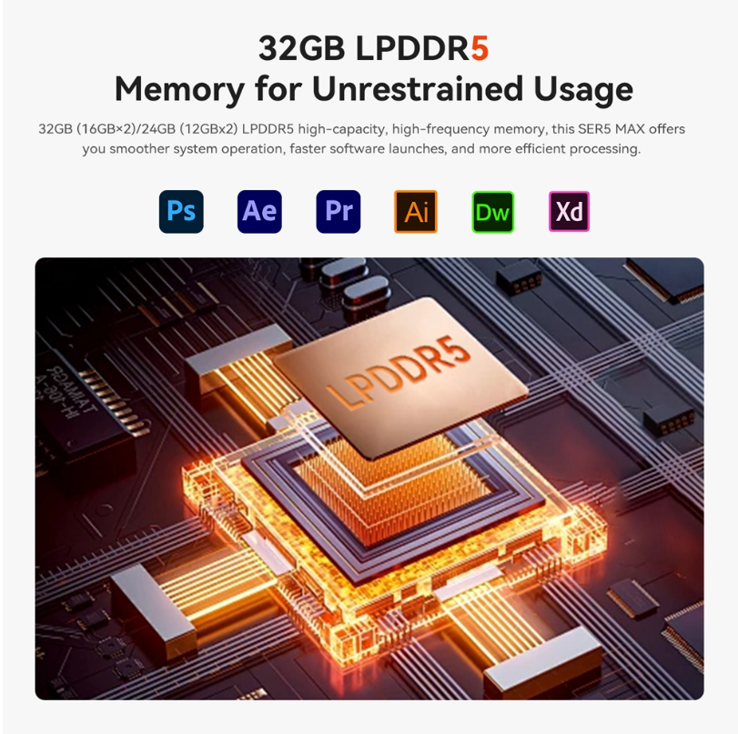 Με ισχυρό επεξεργαστή AMD Ryzen R7 6800U, μνήμη RAM 24GB, 500GB M.2 SSD και προεγκατεστημένο λειτουργικό Windows 11 Pro, το SER5 Max προσφέρει πολύ ομαλή εμπειρία λειτουργίας για να εργαστείτε, να δείτε ταινίες, να παίξετε παιχνίδια ή να περιηγηθείτε στο διαδίκτυο, από το σπίτι ή το γραφείο.