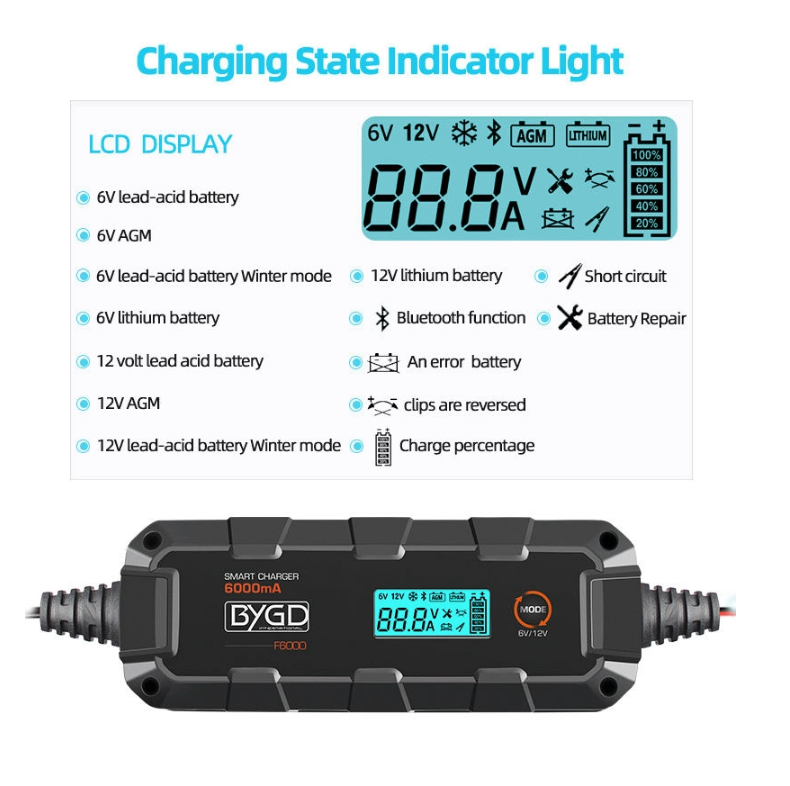 BYGD φορτιστής & συντηρητής μπαταρίας αυτοκινήτου F6000 με οθόνη, 6-12V/6A