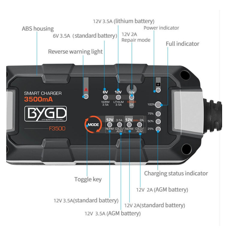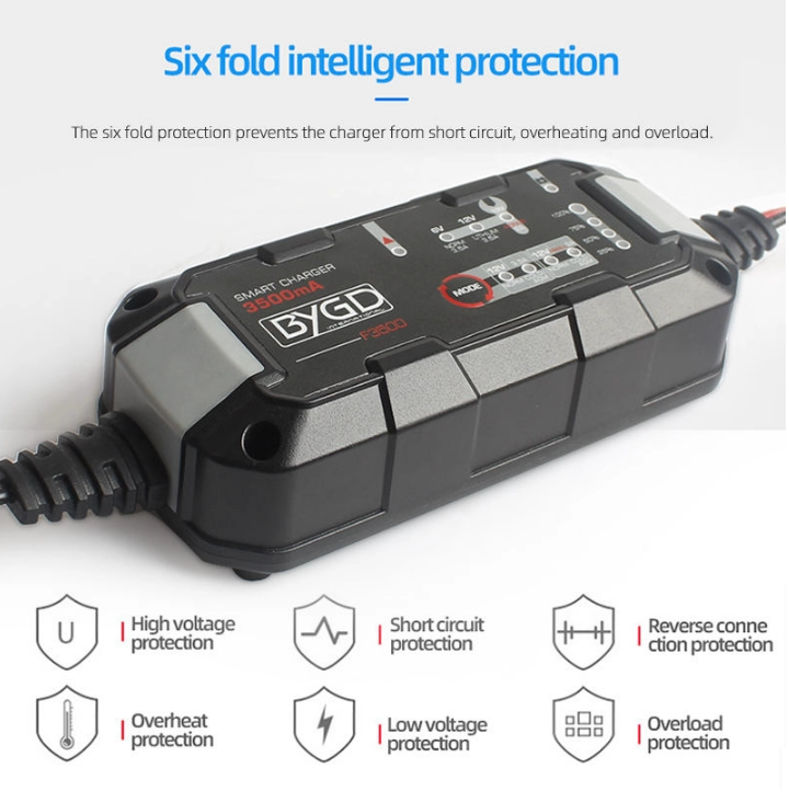 Ο BYGD F3500 είναι ένας αξιόπιστος και έξυπνος φορτιστής-συντηρητής μπαταρίας, ιδανικός για αυτοκίνητα, μοτοσυκλέτες και άλλα οχήματα με μπαταρίες 6V ή 12V.